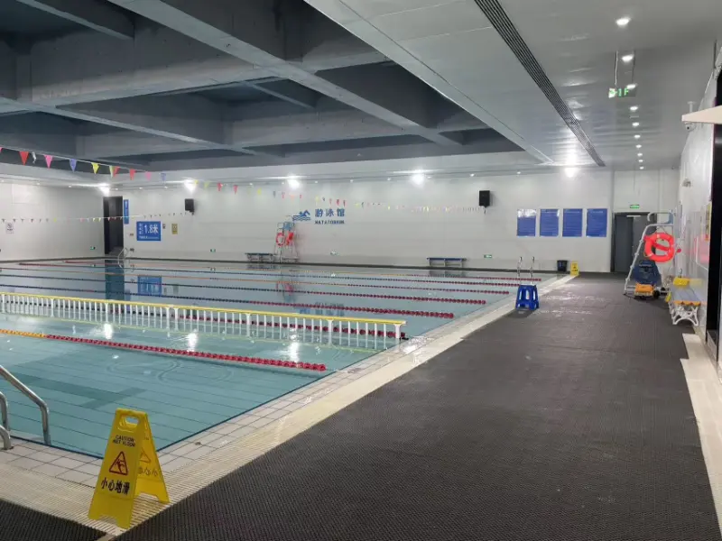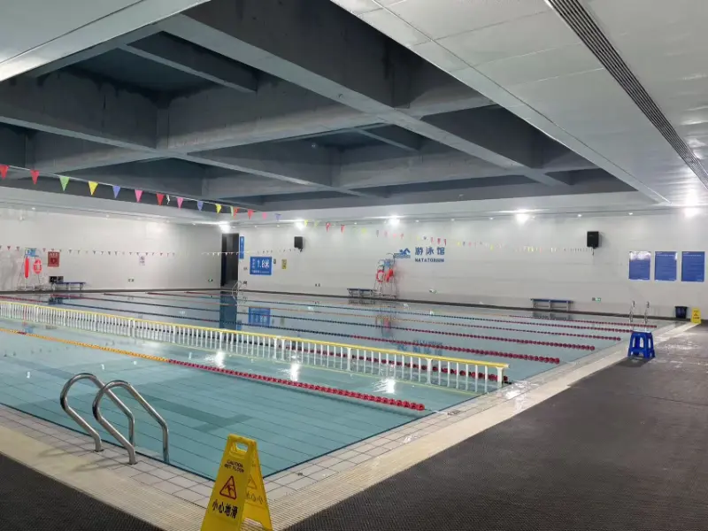 O exterior da piscina apresenta um sistema de painéis metálicos em escala de peixe, criando um efeito de luz e sombra semelhante a uma escama que muda com a curvatura da fachada e a direção da luz solar, realçando o “fluxo da água”. Toda a estrutura da cobertura da zona da piscina interior está exposta, com uma treliça de 48 metros, realçando a expressão explícita da lógica estrutural e reforçando a escala espacial e a sensação de potência do recinto desportivo. O local abriga duas piscinas: uma piscina de competição e uma piscina de treinamento. A piscina de competição tem 50 metros de comprimento e 25 metros de largura, com 8 pistas; a piscina de treinamento tem 50 metros de comprimento e 17 metros de largura, com 6 pistas. Ambas as piscinas têm 2 metros de profundidade.
